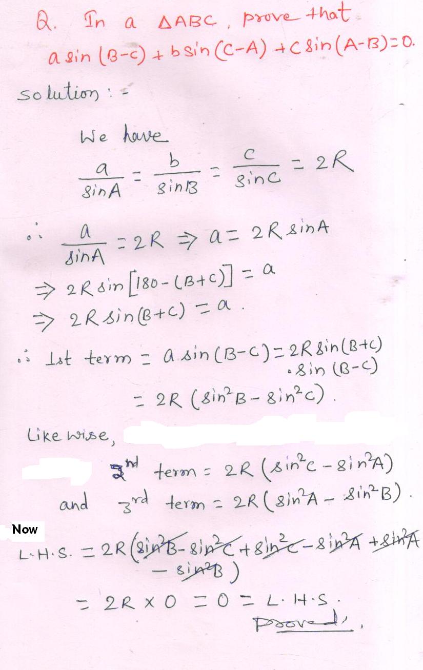 In Triangle Abc Prove That A2sin B C Sin A B2sin C A Sin B C2sin A B Sin C 0 Math Trigonometric Functions 11296755 Meritnation Com