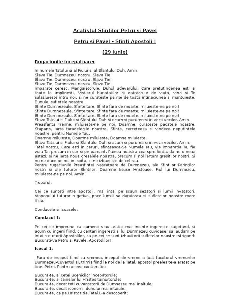 Condacul 1 pe cei ce împreună cu oamenii s au arătat mai înainte îngereşte cugetând şi acum cu îngerii fiind cu cântări îngereşti şi lui dumnezeu cuvioase să lăudăm pe întâi stătătorii apostolilor ca pe cei ce sunt izbăvitorii sufletelor noastre strigând. Sfântul apostol pavel care mai înainte de apostolie se numea saul era de neam iudeu din. In numele tatalui si al fiului si al sfantului duh amin. Sfântul apostol petru care mai înainte de apostolie se numea simon era de neam iudeu din hotarele galileei cea din palestina dintr o cetate mică şi neslăvită care se numeşte betsaida.