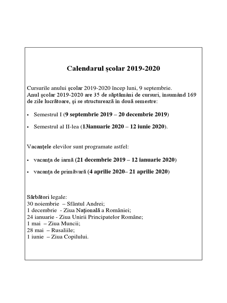 Elevii vor incepe cursurile mai devreme in data de 9 septembrie 2019 si vor intra in vacanta de vara pe 13 iunie 2020.