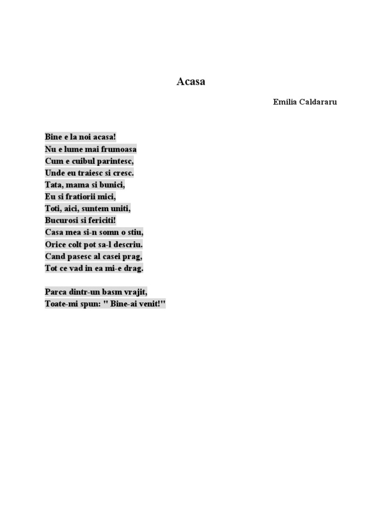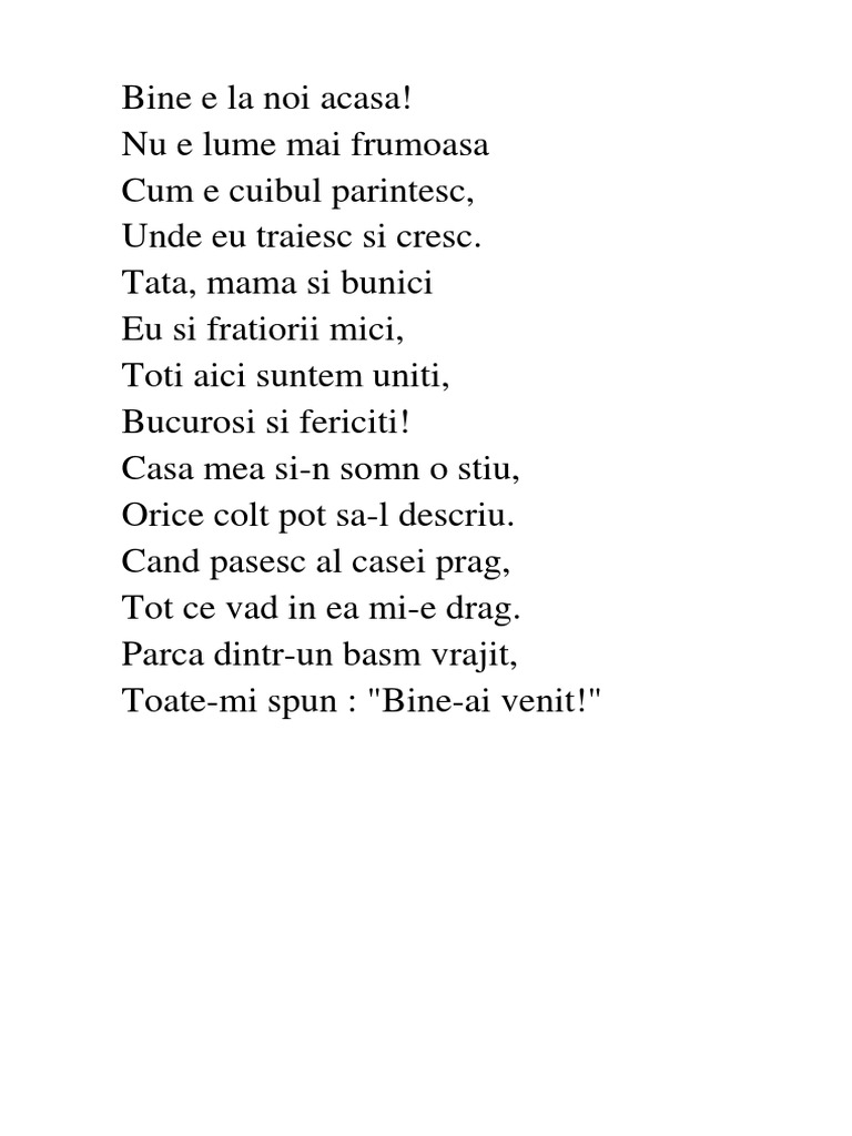 Nu e lume mai frumoasă cum e cuibul părintesc unde eu trăiesc și cresc. Cand pasesc al casei prag tot ce vad in ea mi e drag. Bine e la noi acasă. Când pășesc al casei prag tot ce vad în ea mi e drag.