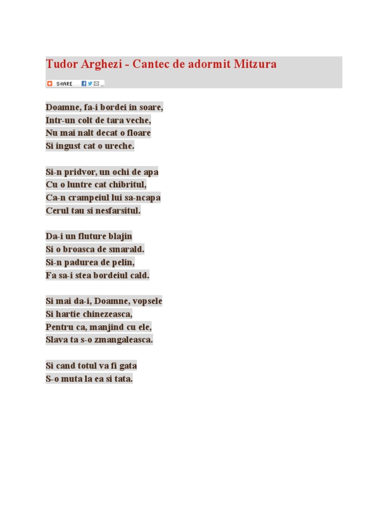 Cantec De Adormit Mitzura De Tudor Arghezi Pdf Document