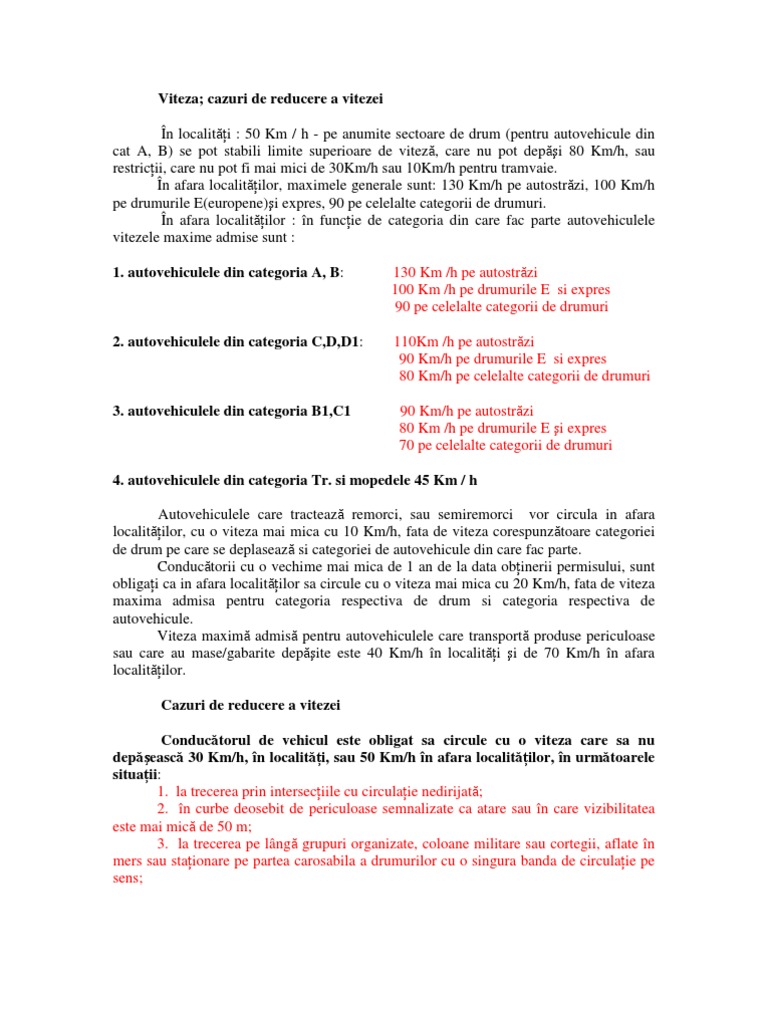 110 km h pe autostrazi 90 km h pe drumurile expres sau pe cele nationale europene e si 80 km h pe celelalte categorii de drumuri pentru autovehiculele din categoriile c d si subcategoria d1 90. Vitezele maxime admise pentru subcategoria de autovehicule b1 sunt. 1 vitezele maxime admise în afara localităţilor pentru categoriile de autovehicule prevăzute la art. 120 km h pe autostrăzi 90 km h pe drumurile expres sau naţionale europene şi 60 km h pe celelalte categorii de drumuri.